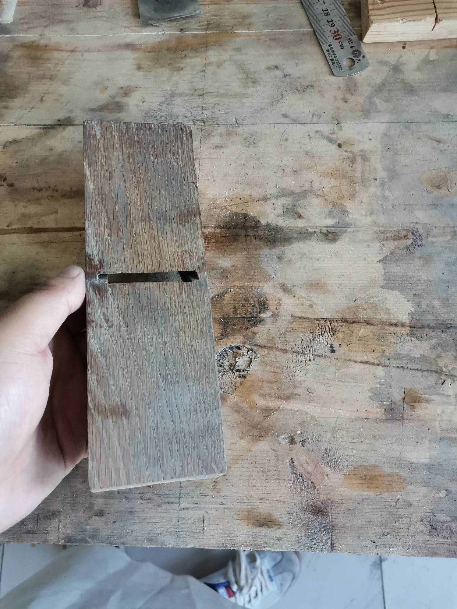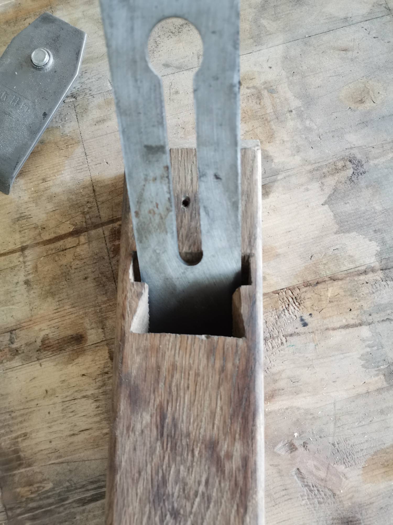 你只捡到刨体,原配的刨刀是和这个尺寸应该是配套的。你现在要配新刨刀就要自己修了,直接找到合适的刨刀估计难。自修是用盖铁还是木楔咱也没经验,不敢乱讲。